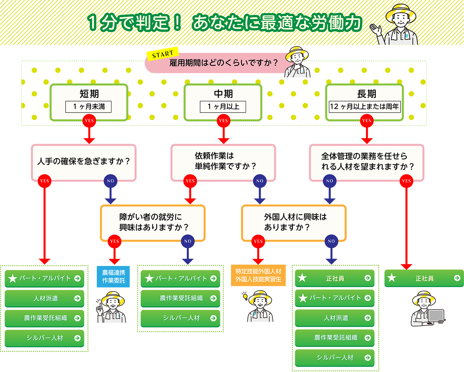 ※本フローは一般的な目安です。実際の現場では、複数の雇用形態を組み合わせて活用するケースも多くありますので、詳細はお近くの農業改良普及センターにご相談ください。